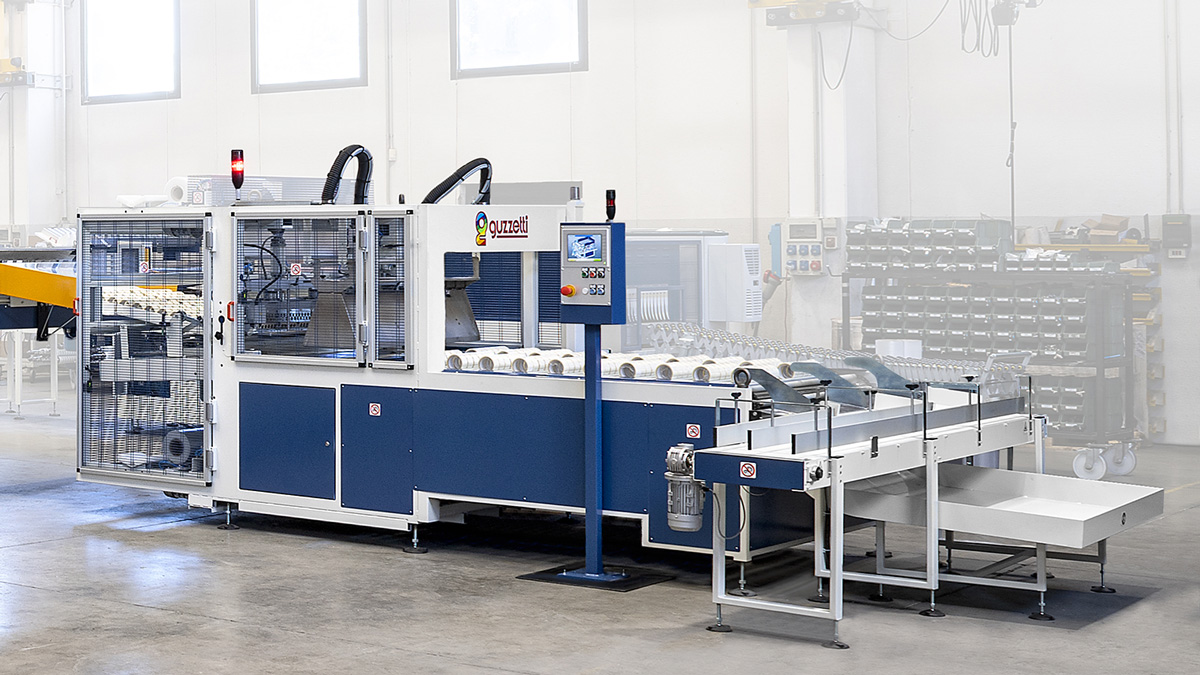 La envolvedora automática mod. RS 3 está concebido para el envoltorio de rollos de cinta adhesiva con material termocontraíble en configuración de acordeón o torre.