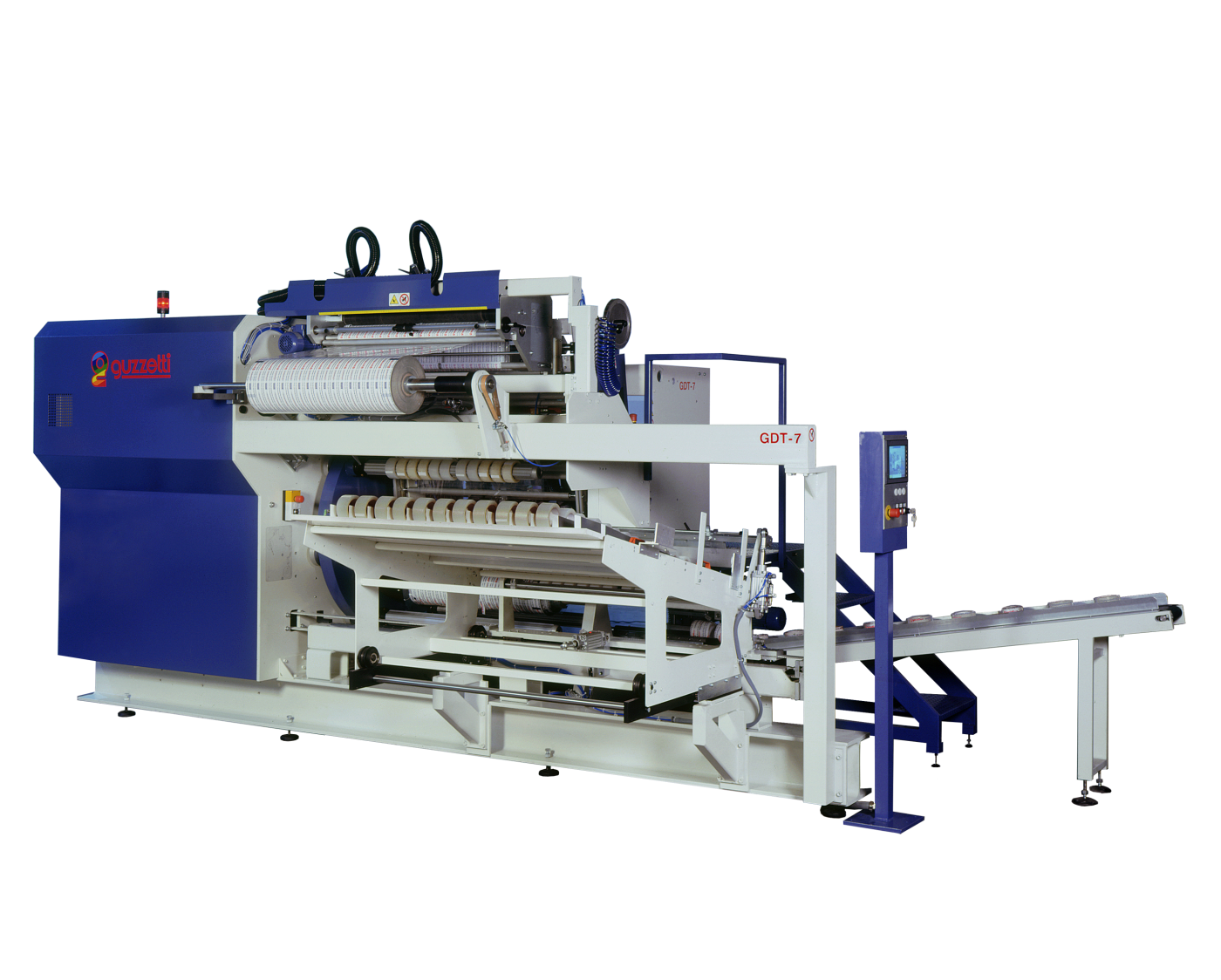 La GDT 7 è una macchina imballatrice innovativa per l’imballo singolo di rotoli di nastro adesivo riavvolti su anime da 3” utilizzando film termoretraibile (PVC e PE stampato o neutro).